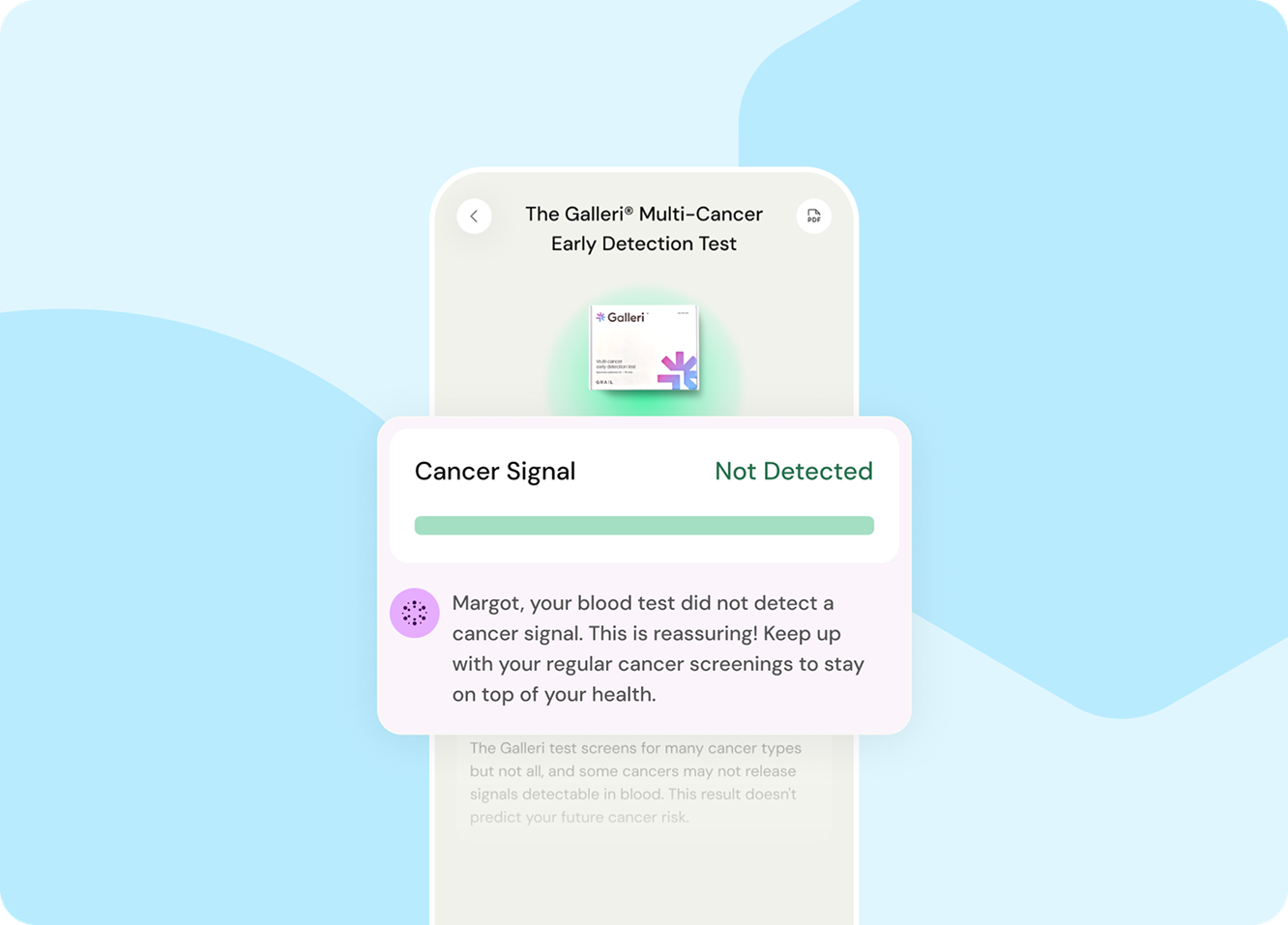 Test results are ready and sent approximately 2-4 weeks after your sample arrives at Galleri's lab.